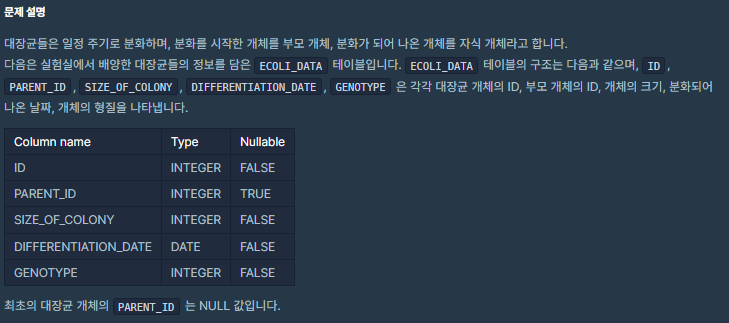 [프로그래머스 SQL] 연도별 대장균 크기의 편차 구하기 (SUM, MAX, MIN) | MySQL하단의 목차를 클릭하여 이동할 수 있습니다 :)1. 문제2. 해답3. 풀이1. 문제SELF JOIN해당 문제는 연도별로 MAX(SIZE_OF_COLONY)를 구하고 각 연도별 SIZE_OF_COLONY를 참감해 주어야 한다.문제는 GROUP BY로 연도별로 그룹화 할 경우 MAX(SIZE_OF_COLONY)는 구할 수 있으나 SIZE_OF_COLONY를 차감할 수가 없다. (집계가 아님).따라서 SELF JOIN문에 SUBQUERY를 사용하여 MAX(SIZE_OF_COLONY)를 추출한 뒤 다시 원본 테이블의 SIZR_OF_COLONY를 차감해준다.2. 해답SELECT YEAR(A.DIFFERENTI..